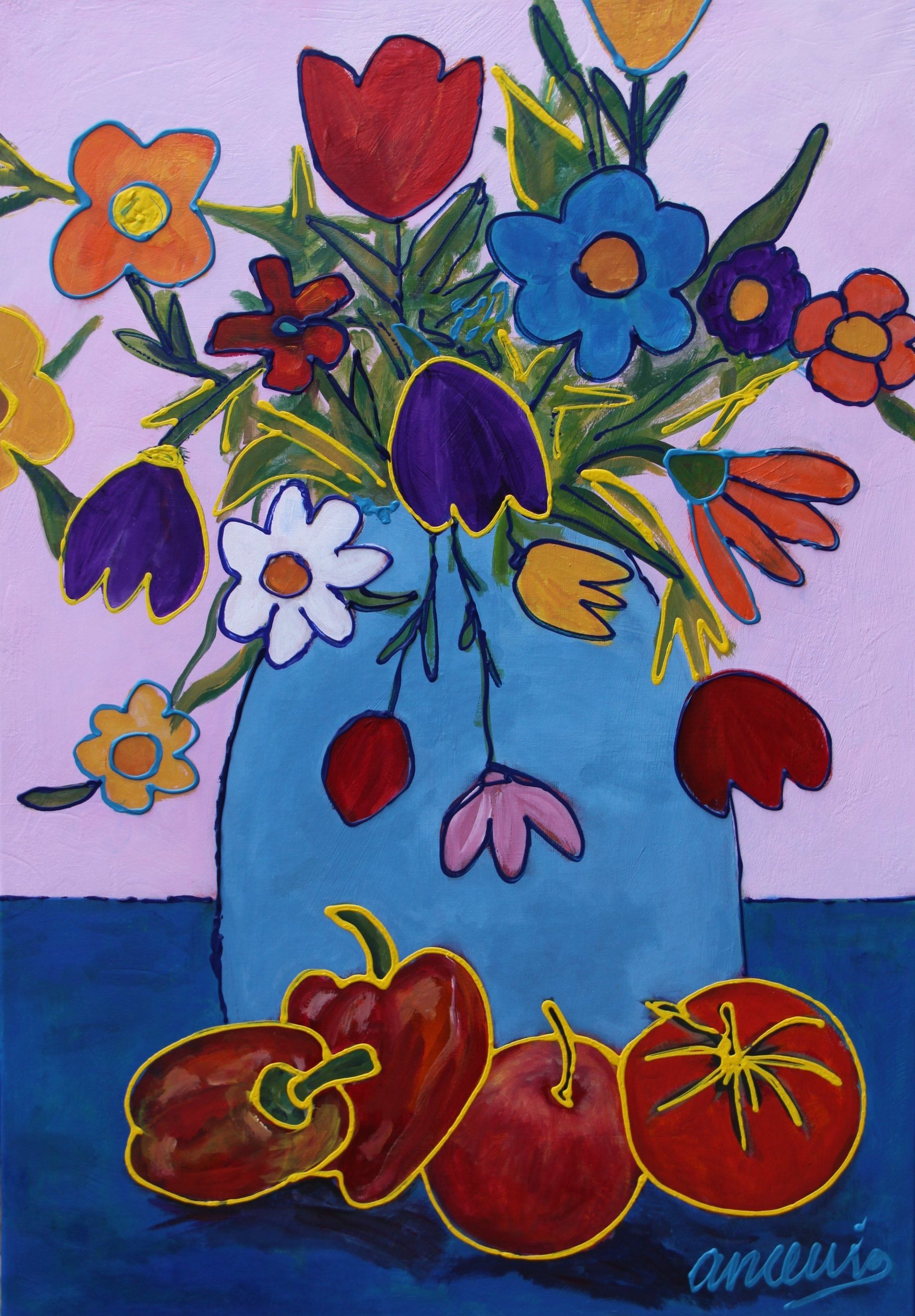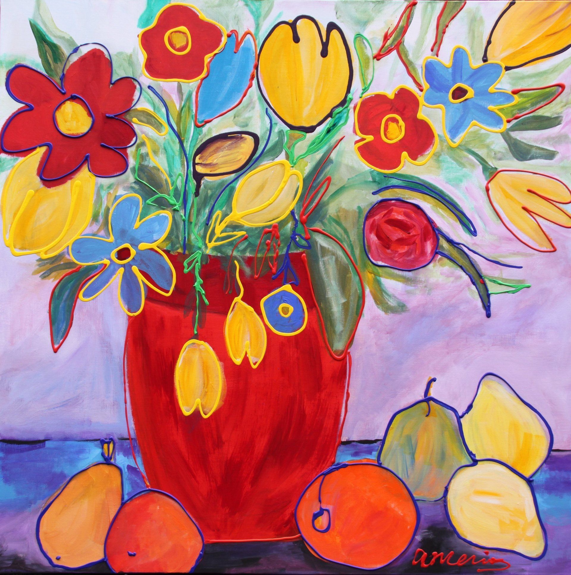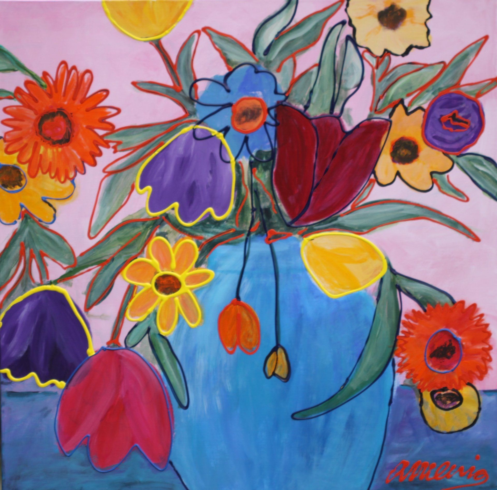 Bloemen in vaas acryl 80 x 80 cm